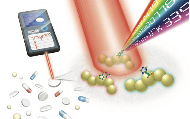 SERS用金ナノ粒子を試料に加え、小型のラマン検出器でレーザーを照射することで、nMレベルの試料を検出することができます。